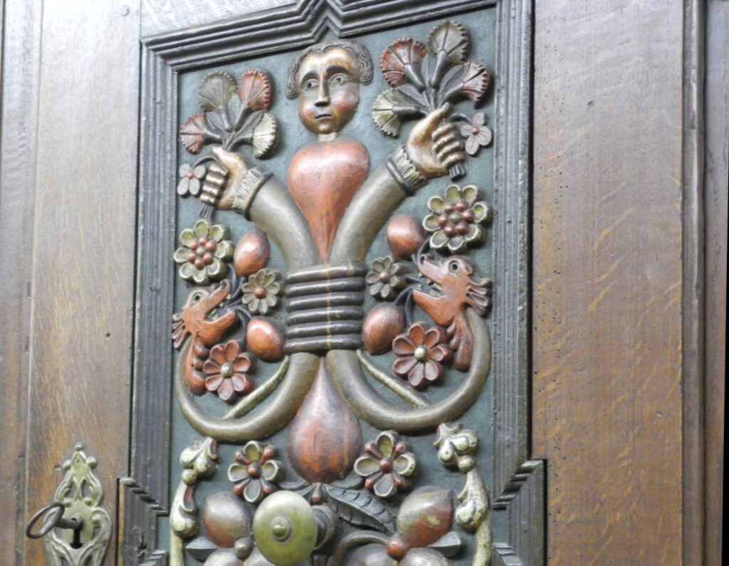 BU1: Phantasievolle Schnitzerei auf einem ländlichen Kleiderschrank, entstanden um 1815-1825.