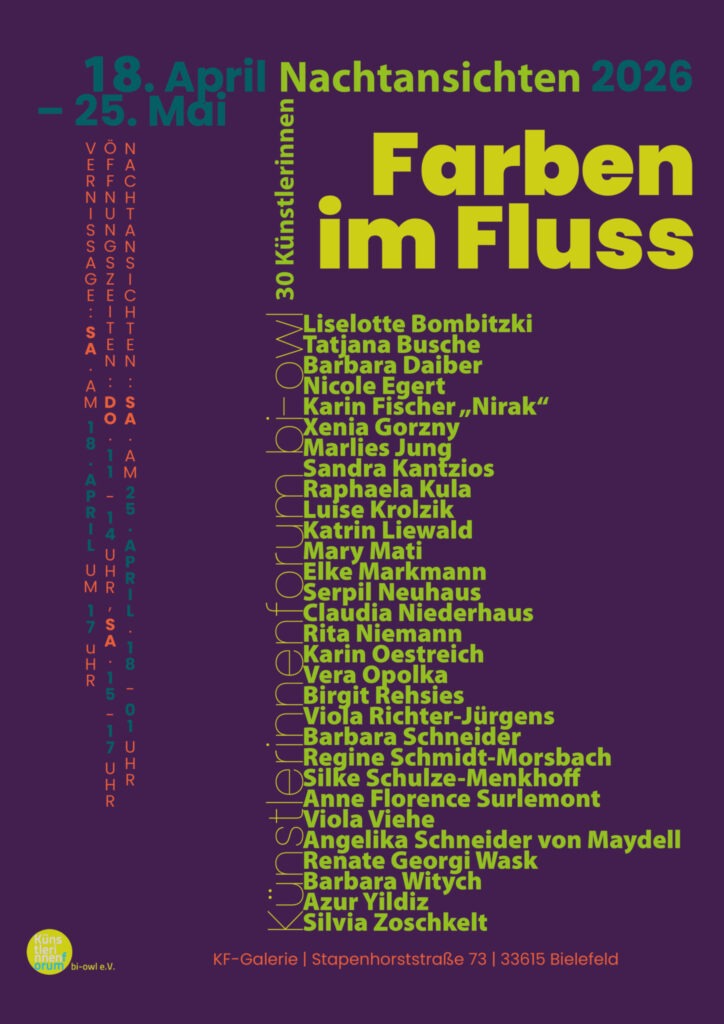 31 Künstlerinnen zeigen in der KF-Galerie vom 18. April bis zum 25. Mai die Vielfalt des Künstlerinnenforums mit Werken zum Thema „Farben im Fluss“. Die Vernissage findet am 18. April um 17 Uhr statt.