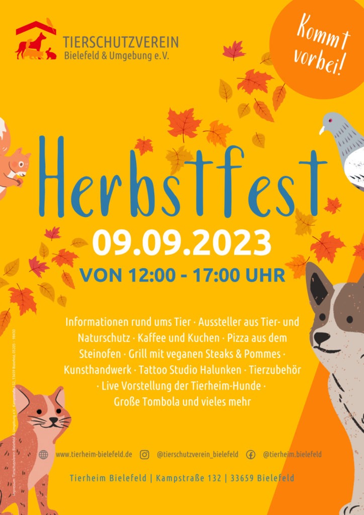 Im Tierheim Bielefeld findet wieder das jährliche Herbstfest des Bielefelder Tierschutzvereins statt. Die Besucher*innen erwartet ein buntes Programm mit Informationen aus Tier- und Naturschutz, Kaffee und Kuchen, Pizza aus dem Steinofen, Grill mit veganen Steaks & Pommes. Außerdem Stände mit Kunsthandwerk und Tierzubehör. Zudem wieder das Tattoo Studio Halunken mit Live-Tätowieren sowie eine Vorstellung der Tierheim-Hunde. Nach mehreren Jahren Pause lockt endlich wieder die große Tombola mit über 1500 Losen, Preise sind unter anderem Karten für die Shows von Martin Rütter und Atze Schröder.