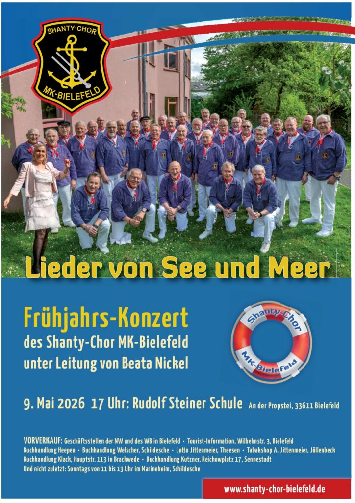 Mit seinem traditionellen Frühjahrskonzert „Lieder von See“ will der Shanty-Chor MK Bielefeld unter der Leitung von Beata Nickel auch in diesem Jahr wieder seine Fans und jene, die es noch werden wollen, mit schwungvollen seemännischen Songs unterhalten und begeistern. Mit neuen Shantys, maritimen Songs mit schwungvollen Arrangements populärer seemännischer Melodien im Seesack, so legt der Bielefelder Shanty Chor zu seinem ersten Konzerttörn 2026 ab. www.shanty-chor-bielefeld.de