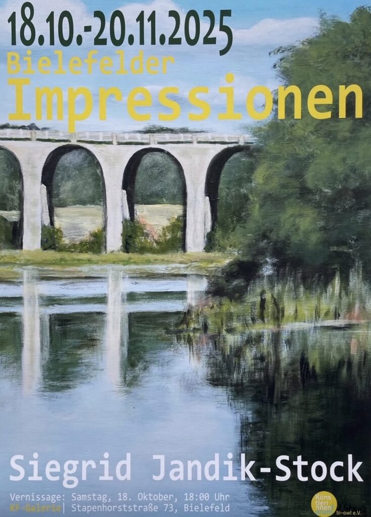 So lautet das Motto der neuen Ausstellung in der KF-Galerie des Künstlerinnenforum Bielefeld. Mitte der 1990er Jahre von München nach Bielefeld gezogen, hat Siegrid Jandik-Stock die Stadt bald kennen und lieben gelernt und diese in malerischen Bildern verewigt. Bis zum Renteneintrittsalter arbeitete sie selbstständig in Sachen Mode mit einem eigenen Atelier in München. Die letzten Jahre stand die Malerei im Fokus und so sind die Bielefelder Bilder entstanden, die sie nun in der KF-Galerie zeigt.