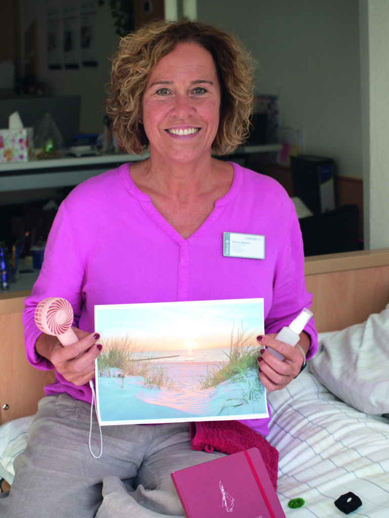 Was sie jedoch tun können, vermittelt der Kurs ganz konkret und praxisnah. „Die Mundpflege ist neben der Behandlung von Schmerzen und Atemnot das Wichtigste“, weiß Bianca Michler. Ihr Tipp: Ein Getränk, dass der Mensch mag, sei es Saft oder Rotwein, in ein kleines Sprühfläschchen füllen und einen Sprühstoß auf die Zunge geben. „Das ist angenehm, regt den Speichelfluss an, aber man verschluckt sich nicht daran“. Gegen Mundtrockenheit helfen auch kleine, runde Minieiswürfel zum Beispiel aus pürierten Erdbeeren. Die lassen sich in Pralinenschachteln einfach selbst herstellen. Bei Atemnot kann ein kleiner Handventilator hilfreich sein. „Wenn wir Wind im Gesicht spüren, atmen wir unbewusst tiefer ein. Aber auch, wenn der Blick in die Weite geht, macht das was mit uns, da kann schon ein Bild vom Meer helfen.“ Gegen Unruhe empfiehlt sie, ein paar Tropfen Lavendelöl auf einem Tupfer neben den Kopf zu legen.