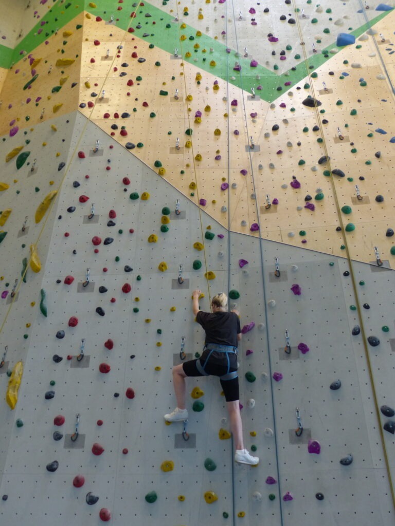 Genau, denn vor fünf Jahren hat der Deutsche Alpenverein, Sektion Bielefeld, das Alpinzentrum an der Meisenstraße eröffnet. Auf 2.000 Quadratmetern bietet die moderne Halle Klettern und Bouldern in verschiedenen Schwierigkeitsgraden. Für Groß und Klein, Anfänger und Fortgeschrittene. Ob Schnupperkurse für Einsteiger, Kindergeburtstage oder spezielle Angebote für Studierende oder Menschen mit Beeinträchtigung – hier kann sich wirklich jede und jeder unter fachkundiger Anleitung auf den Weg nach oben machen. Offene Kletter- und Bouldertreffs ergänzen das vielfältige Kursangebot. Und damit es für Fortgeschrittene nicht langweilig wird, werden wöchentlich neue Routen mit unterschiedlichen Niveaus geschraubt.