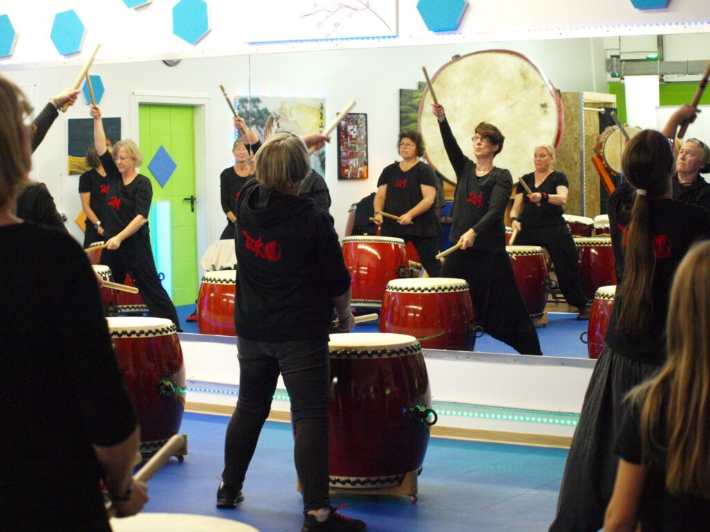 Ich schlüpfe jetzt lieber in die Rolle der Zuschauerin und Zuhörerin, um die Gruppe beim Training nicht weiter aufzuhalten. Die komplexe Choreografie, die Augen- und Ohrenweide zugleich ist, begeistert mich. Es ist ein ästhetisches Vergnügen zu erleben, wie die Trommelnden zu einer einzigen kraftvollen Einheit verschmelzen. Ist die jahrtausendealte japanische Tradition jetzt Musizieren, Tanzen oder Kampfsport? Eindeutige Antwort: alles zusammen.