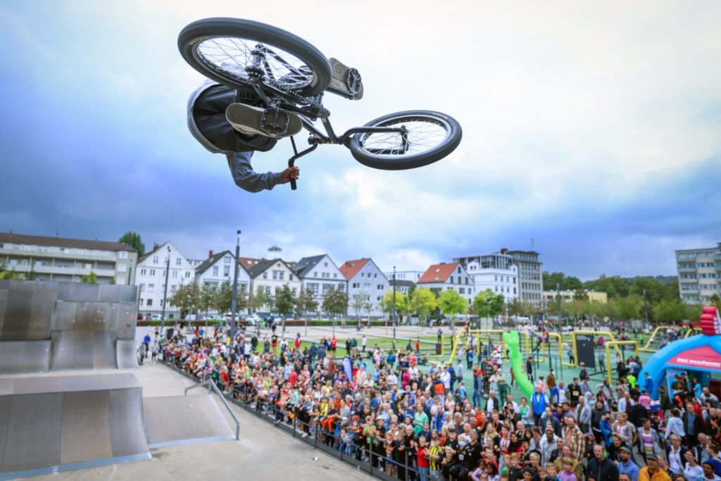 Als einer der größten innerstädtischen Skateparks Europas ist der Spot längst mehr als nur Trainingsfläche: Er ist Bühne, Treffpunkt und Playground zugleich. Die moderne Betonlandschaft mit Rampenpark im östlichen Bereich des Kesselbrinks mit großer Halfpipe in Wettkampfmaßen, Funbox sowie zwei Plaza-Bereichen bietet die Bühne für spektakuläre Tricks und Kunststücke, die für reichlich Adrenalin sorgen. Hier gibt’s täglich eindrucksvolle Runs. Und wer selbst nicht auf die Rampen möchte, schaut einfach zu. Beim jährlichen Skateboard-Event „Kesseljam“ oder auch beim „Stadtwerke run & roll City“ – 2026 findet das Event unter neuem Namen am 13.9. statt – steht der Kesselbrink als Veranstaltungsgelände im Mittelpunkt.
