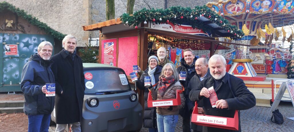 Bereits seit 15 Jahren laden die Stiftung Solidarität bei Arbeitslosigkeit und Armut und die Stiftung Welthaus Bielefeld gemeinsam zur sozialen Weihnachtslotterie auf dem Bielefelder Weihnachtsmarkt ein. Was 2010 als Kooperation für das Gute begann, ist heute eine feste Institution in der Adventszeit. Vom 20. November bis zum 30. Dezember 2025 können alle Neugierigen am Lotteriestand auf dem Altstädter Kirchplatz direkt neben dem Riesenrad ihr Glück versuchen. Insgesamt warten 20.000 Lose auf neue Besitzer*innen – Nieten gibt es nicht und jedes Los verspricht zumindest einen kleinen Gewinn.