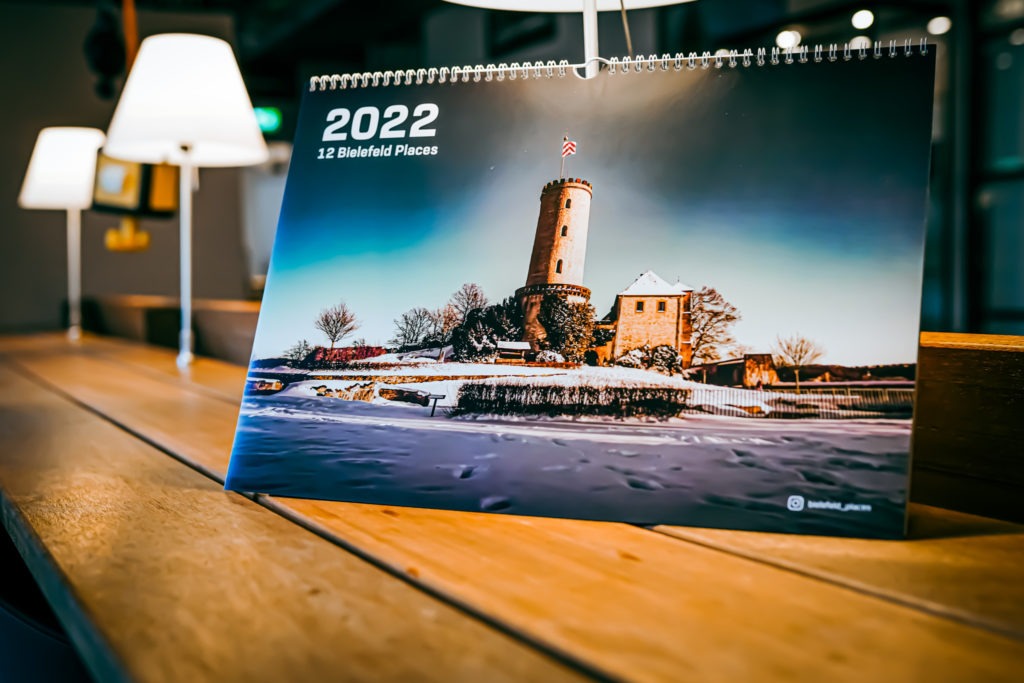 12 Motive – 12 Bielefeld Places: Ob Sparrenburg, Olderdissen oder Kunsthalle, Franziska Beckmann hat für den DIN A3 Monatswandkalender 2022 Bielefeld aus immer wieder neuen Perspektiven eingefangen.