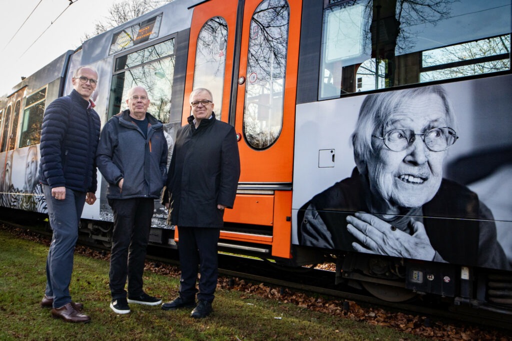 Bei der Präsentation der neuen Bahn auf den Schienen vor der Bielefelder Kunsthalle dankte Pastor Ulrich Pohl, Vorstandsvorsitzender der v. Bodelschwinghschen Stiftungen, den Menschen, die sich von Veit Mette fotografieren ließen und nun auf den Zügen sichtbar sind. „Mein Dank gilt außerdem moBiel, die uns die Flächen weiterhin zur Verfügung stellt“, betonte Pastor Pohl. Martin Uekmann, Geschäftsführer von moBiel und den Stadtwerken Bielefeld, sagte, die Bethel-Bahn sei weit mehr als ein Verkehrsmittel: „Sie symbolisiert die Vielfalt und das Miteinander in Bielefeld. Es freut mich, dass Menschen aus Bethel jeden Tag sicher und barrierefrei mit der Stadtbahn unterwegs sind. Das ist für mich gelebte Teilhabe und ein starkes Zeichen für Inklusion in unserer Stadt.“